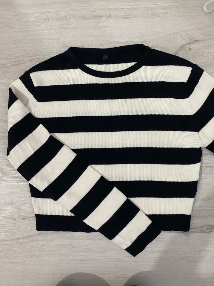Kadınlar için uzun kollu, bisiklet yaka ve siyah beyaz çizgili, pamuklu triko kazak. Örgü dokusu ve normal boyu günlük kullanıma uygundur. Trendy casual tarz için ideal.