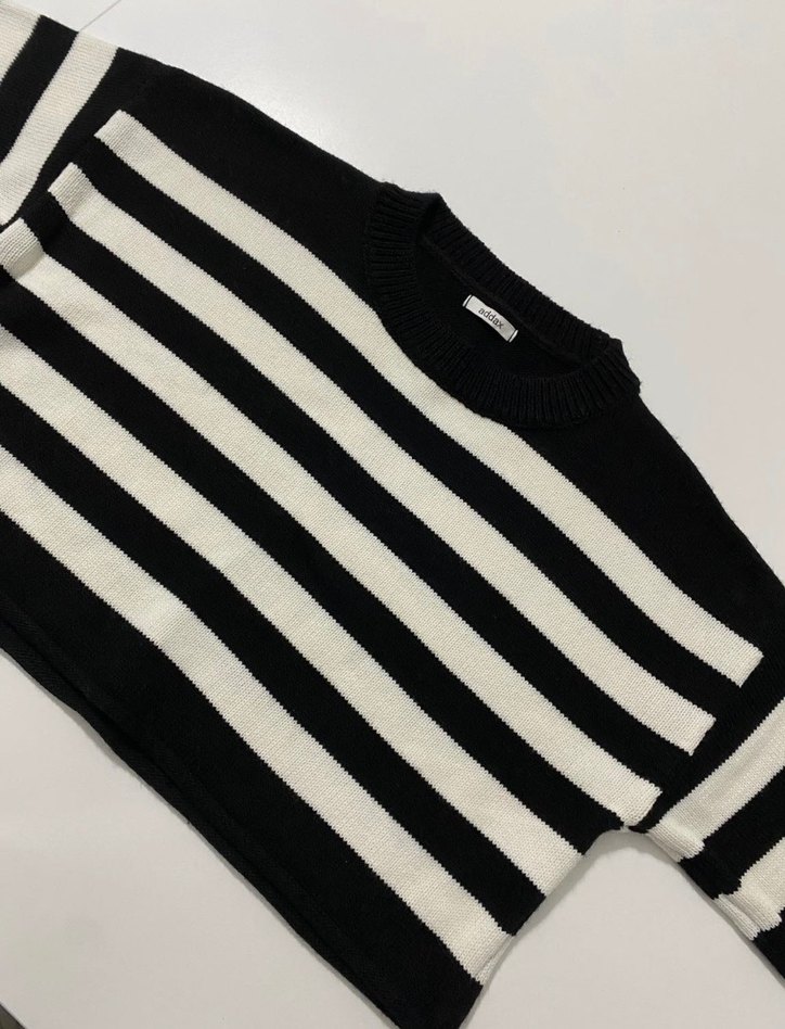 Kadınlar için uzun kollu, salaş kesim ve kayık yaka detaylı siyah beyaz çizgili triko kazak. Günlük kullanıma uygundur.