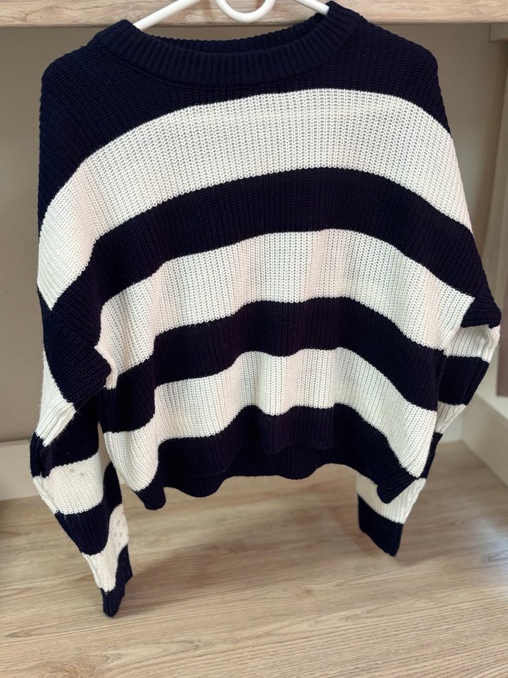 Kadınlar için uzun kollu, yuvarlak yakalı, siyah beyaz çizgili rahat bir triko kazak. Günlük kullanıma uygun, bol kesim ve orta boy uzunlukta.