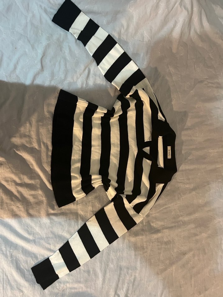 Kadınlar için uzun kollu, yakalı ve siyah-beyaz çizgili triko kazak. Yumuşak sentetik kumaştan örülmüş, günlük kullanıma uygundur.