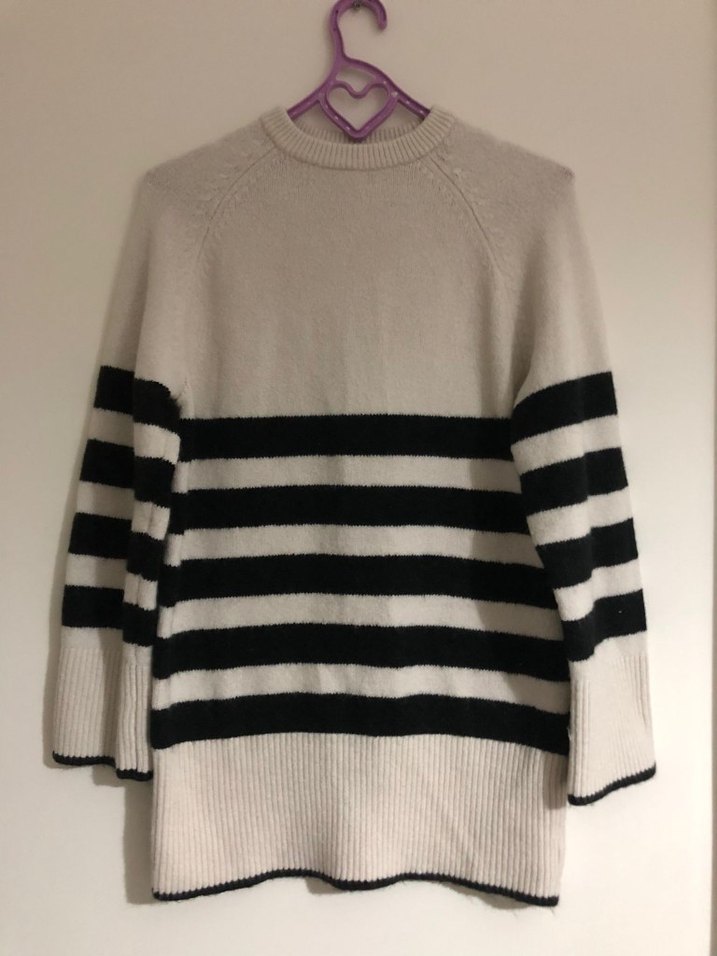 Uzun kollu, bisiklet yaka, yumuşak triko dokulu, bol kesim kadın kazak. Siyah beyaz çizgili deseniyle trend sokak stiline uygundur.