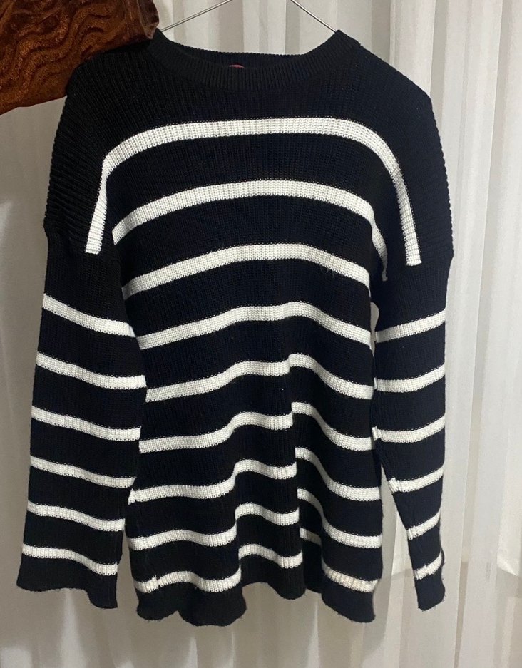 Kadınlar için uzun kollu, yuvarlak yaka, siyah beyaz çizgili, gevşek kesim triko kazak. Orta boy uzunlukta, rahat ve günlük stil için uygundur.