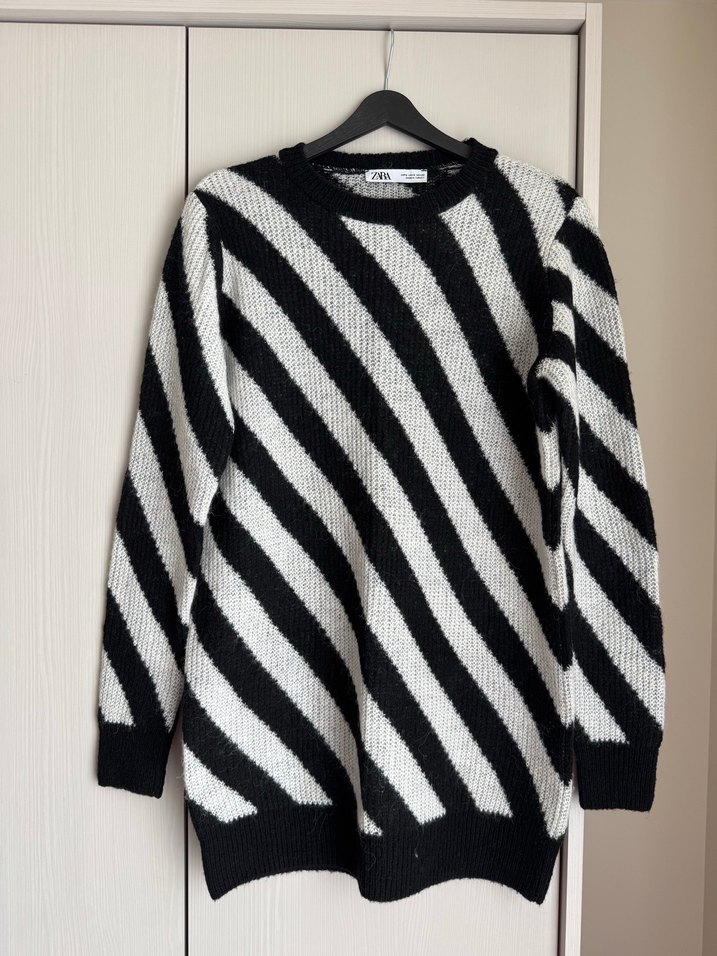 Siyah beyaz çapraz çizgili, uzun kollu, bol kesim triko kazak.