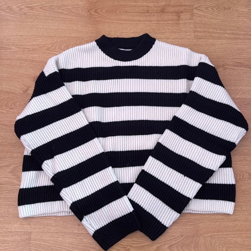 Uzun kollu, bisiklet yaka, siyah beyaz çizgili triko kazak. Rahat ve şık sokak stili için ideal, günlük kullanıma uygun.