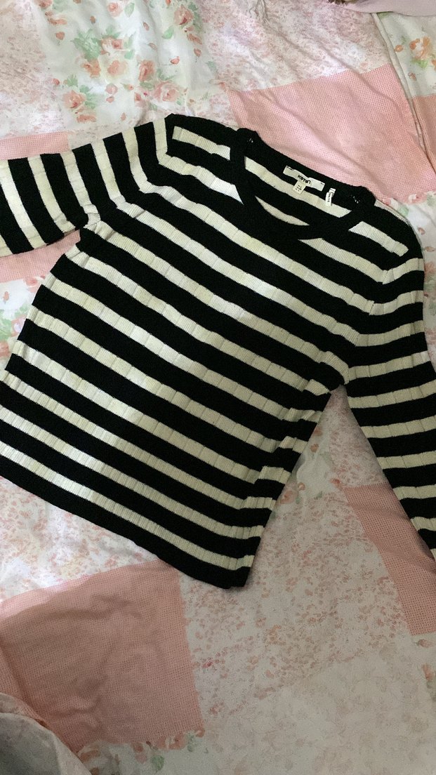 Pamuklu, siyah beyaz çizgili, uzun kollu, ince kesim, midi uzunlukta, kruvaze yaka kadın kazak. Örgü dokusu ve rahat kesimi ile günlük sokak stili için uygundur.