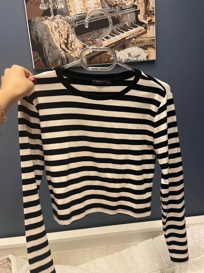 Kadınlar için siyah beyaz çizgili, uzun kollu, bisiklet yaka ve vücuda oturan kesime sahip tişört. Düğme detaylı, midi boyda ve sentetik dokulu kumaştan üretilmiştir. 1 kere kullandım