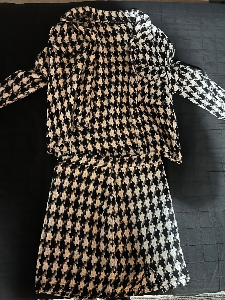 Kadınlar için siyah beyaz desenli, düğmeli ve kesilmiş yaka detaylı ceket ve etek takımı. Sentetik kumaştan, regular fit ve uzun kollu.
