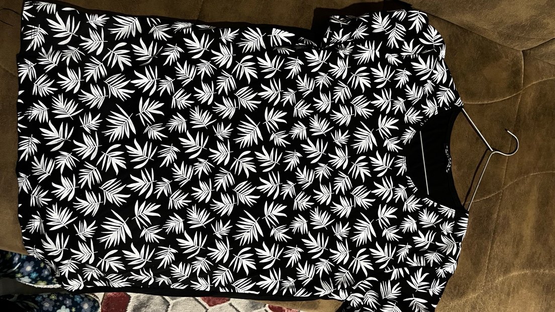 Kadın pareo, siyah zemin üzerine beyaz yaprak desenleriyle. Pilili tasarım ve regular fit, günlük sokak stili için uygun.