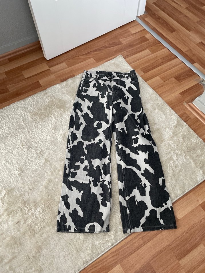 Salaş kesim, siyah-beyaz desenli kadın kot pantolon, kürk detaylı ve midi boyda, rahat sokak stili için uygun.