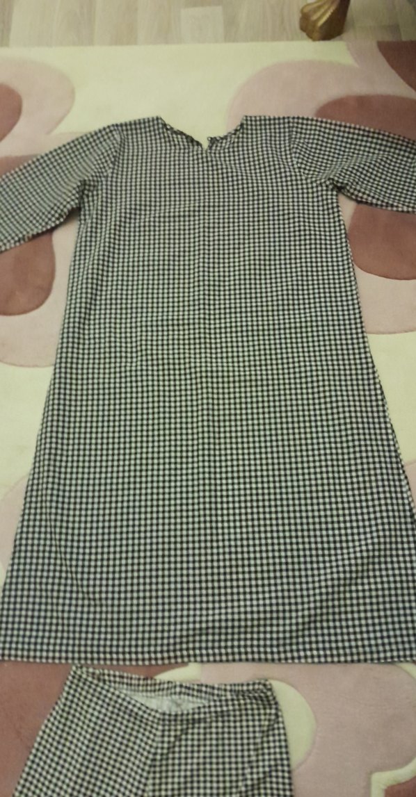 Kadınlar için uzun boy, tekne yaka ve uzun kollu tunik. Yeşil ve gri tonlarında ekose desenli, düğmeli ve sentetik kumaştan yapılmıştır. Günlük kullanıma uygundur. Altı beli lastikli 30 cm fakat 42 cm e kadar açılıyor lastik giyildiginde tunik alti 90 cm paca genişliği 25 cm tunik iki kol arası 50 cm tunik kol boyu 53 cm tunik boyu 101 cm ister dışarıda tesettür kiyafet olarak ister evde kullanabileceğiniz bir takım