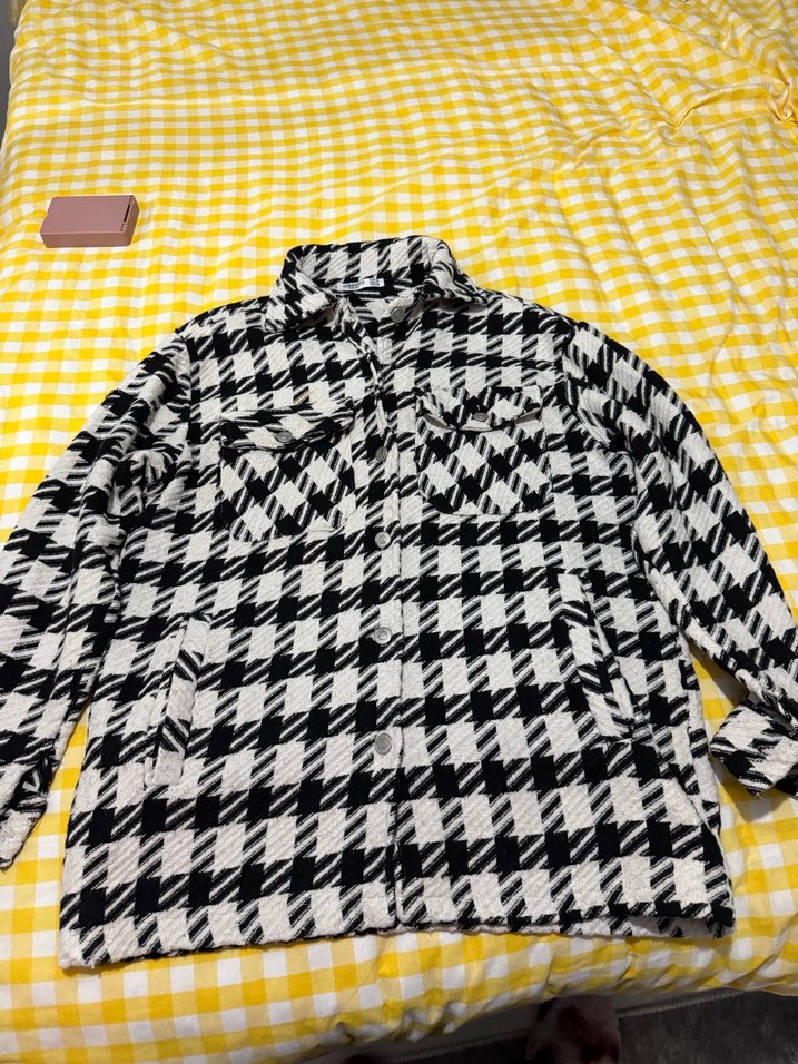 Kadınlar için düğmeli, yakalı, uzun kollu gömlek. siyah beyaz kareli, bol kesim ve günlük kullanıma uygun. Ufak bir lekesi var yıkanırsa geçer