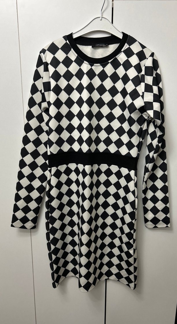 Uzun kollu, kareli desenli ve kemerli, triko kumaştan midi boy dar kesim elbise.