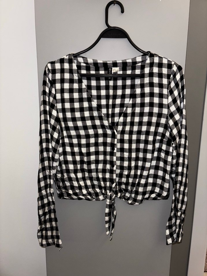 Pamuklu kumaştan yapılmış, uzun kollu bol kesim kadın gömlek. V yaka, düğmeli ve uç kısmında bağlama detayı bulunur. Siyah beyaz kareli deseni günlük rahat stil için uygundur. 38 beden sorunsuz hm marka