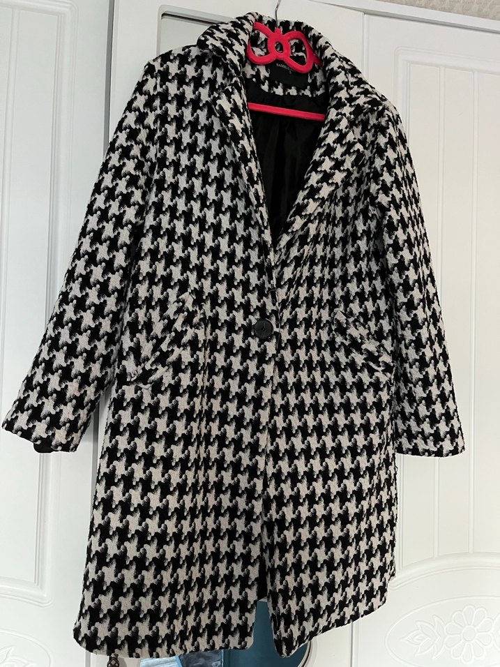 Düğmeli, kruvaze yaka, siyah-beyaz kazayağı desenli kadın midi kaban. Uzun kollu, normal kesim, sentetik kumaştan, günlük sokak stili için uygundur.
