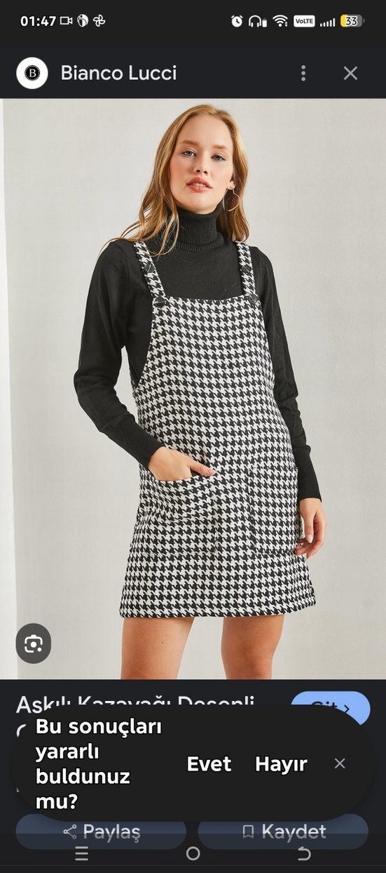 Kadınlar için siyah ve gri kazayağı desenli, askılı, bol kesim mini salopet. Örgü görünümlü sentetik kumaştan, günlük sokak stili için uygun.