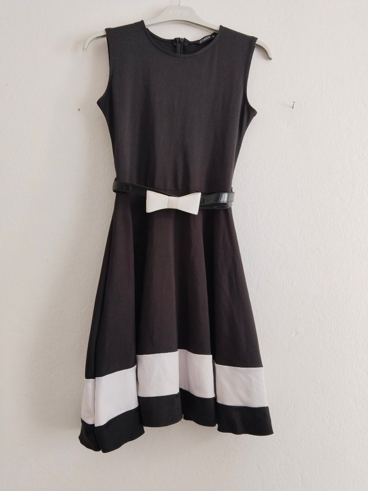 Kadın için kemerli, askısız, siyah beyaz renk bloklu, sentetik kumaştan yapılmış, vücuda oturan şık elbise. kurdela detaylı ayarlanabilir kemeri var.