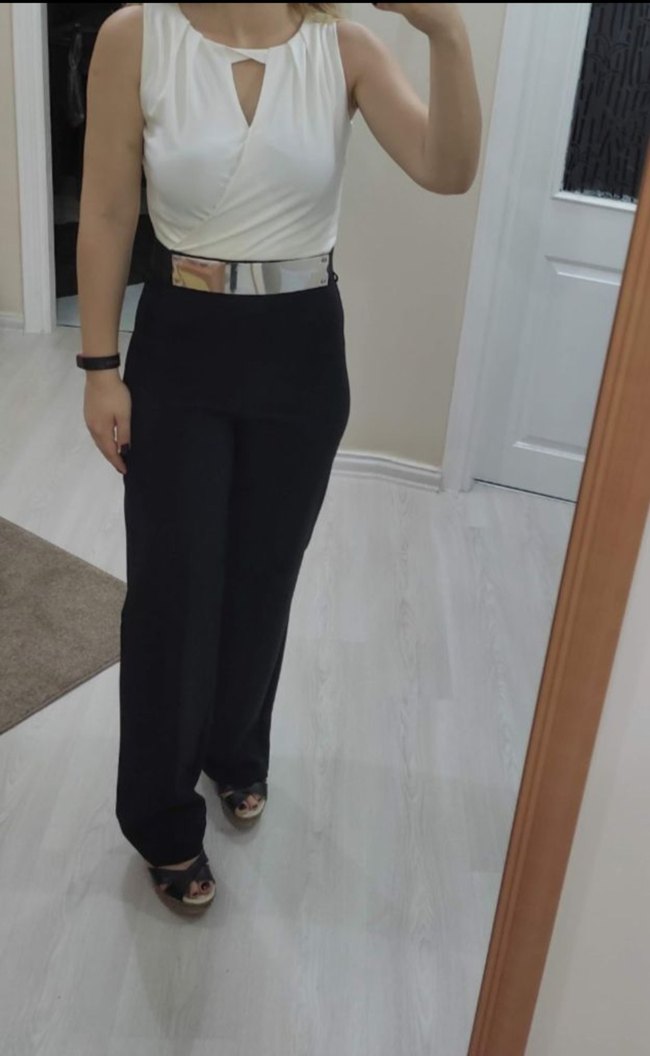 S/36 beden, sadece 1 defa giyilmiş, alt üst iki renk şık tulum, üst kısmı simli, boyundan bağlaması ve sırt dekoltesi var, boy uzunluğu 150cm dir. Şık tulum, V yaka, bel kısmı metal kemerli, bol paça modern kesim. Kaliteli, dökümlü ve tok kumaş, vücuda oturur, rahat kullanım sağlar. Düğün, nişan, davet, mezuniyet veya akşam yemeği için zarif bir seçimdir. Yüksek bel görünümüyle boyu uzun gösterir. Profilimdeki diğer modellere de göz atabilirsiniz #tulumkombin #şıktulum #zarifstil #kadınmoda #gecekombin #davetstili #beyazsiyahaşkı #yenigibi #dolapindirim #tulum #kadın #şık #simli