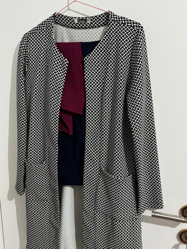 Kadın kaban, uzun kollu, drapeli ve kesik yakalıdır. Normal uzunlukta, midi boyunda, sentetik kumaştan yapılmıştır. Günlük kullanıma uygun, çağdaş Paris tarzında siyah beyaz desendedir.