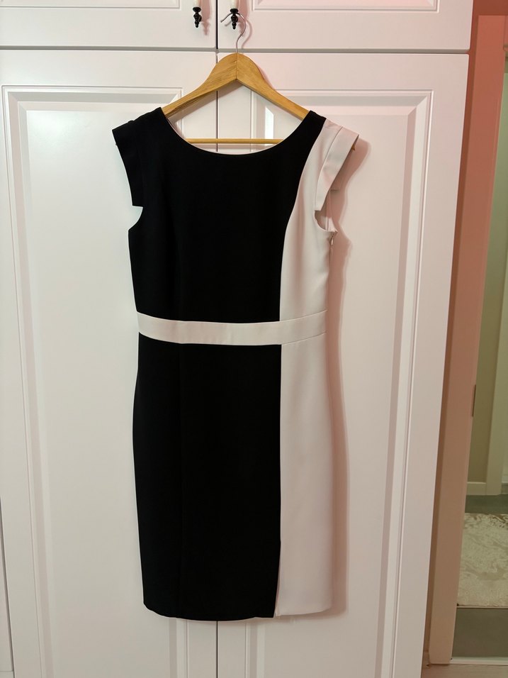 Kemer detaylı, siyah beyaz renk bloklu, kalın askılı midi kalem elbise. Kaygan sentetik kumaştan, ofis kullanımı için uygun.