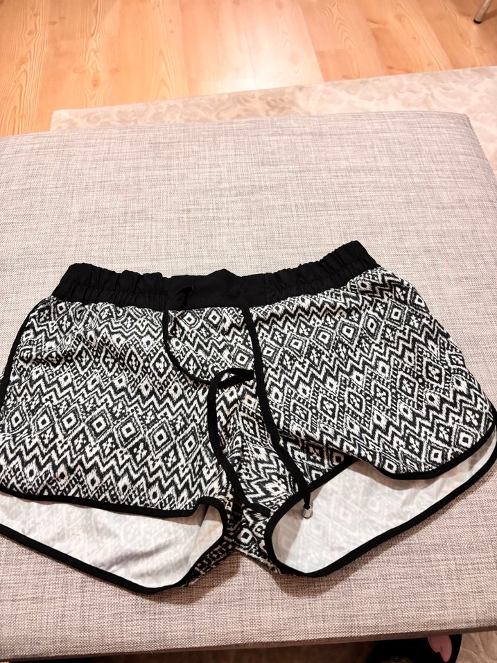 Kadınlar için elastik bel bantlı, siyah-beyaz geometrik desenli,mini deniz şortu.