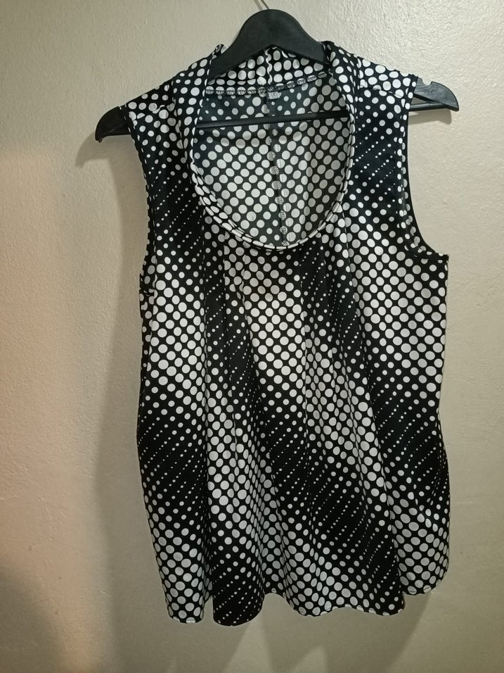 siyah beyaz puantiyeli, kolsuz, sentetik kumaştan yapılmış, midi boy ve yüksek yakalı bluz. vücuda oturan kesim. Boyu 60 cm