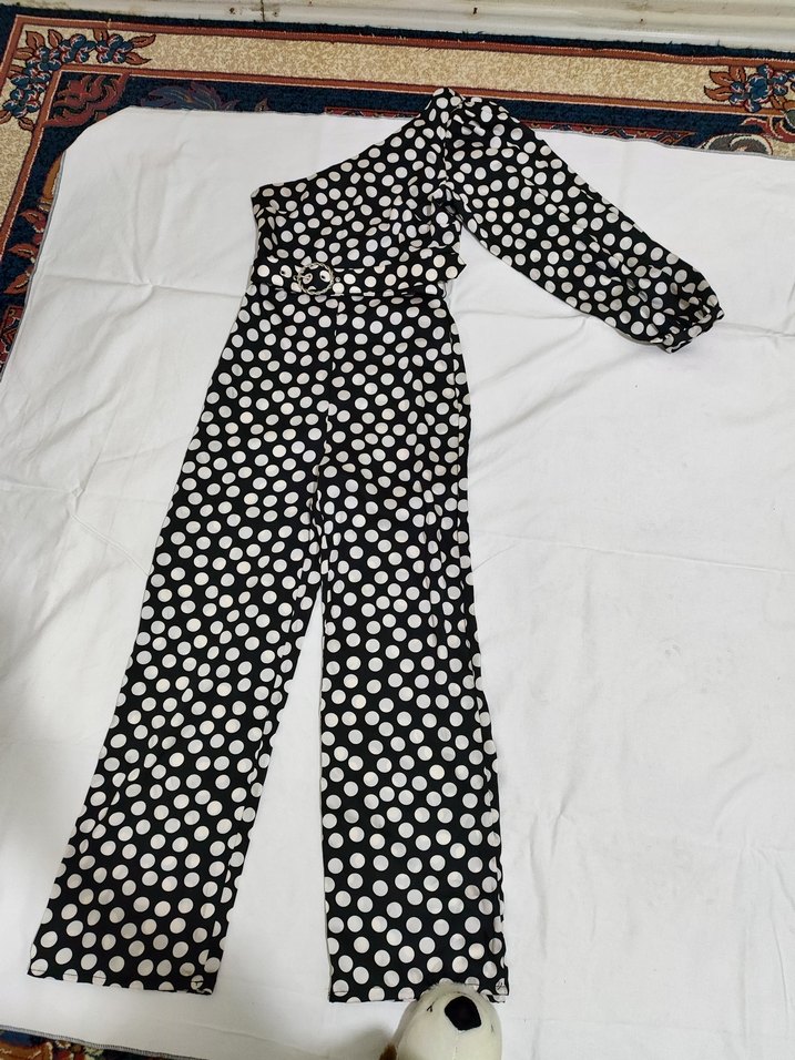 Kadınlar için uzun, siyah zemin üzerine beyaz puantiyeli, tek kollu ve askılı tasarıma sahip tulum. Düğmeli ve V yaka detaylarıyla bohem ve retro tarzını yansıtır.