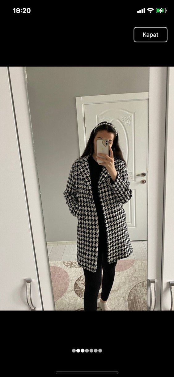 Kadınlar için tasarlanmış, siyah beyaz ekose desenli, puflu tasarımlı, bol kesim kaban. Notched lapel yaka ve uzun kolludur, midi boyda ve sentetik yumuşak kumaştan üretilmiştir. Günlük kullanım için uygundur.