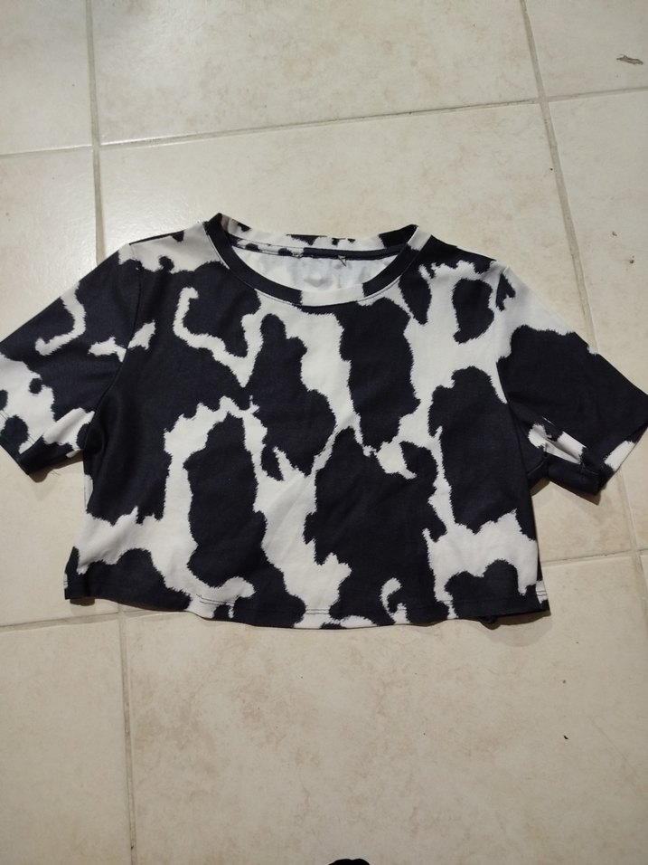 Kadınlar için siyah beyaz tie-dye desenli, kısa kollu, yuvarlak yakalı ve vücuda oturan crop top. Pürüzsüz sentetik kumaştan, günlük şıklık için uygun.