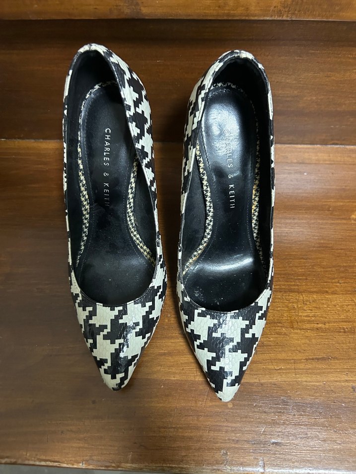 Kadınlar için siyah-beyaz kazayağı desenli, sivri burunlu stiletto topuklu ayakkabılar. İyi durumdadır çok az kullanıldı 36 bedendir .