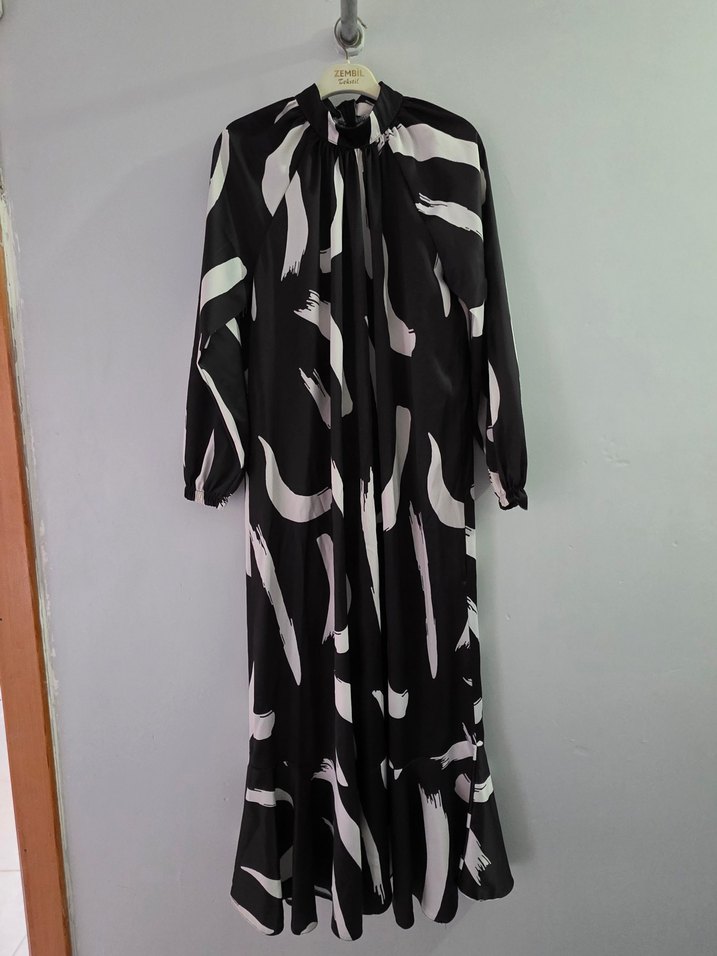 Kadınlar için yüksek yakalı ve uzun kollu, bol kesimli siyah beyaz bağlama desenli uzun elbisedir. Günlük kullanım için uygun drapeli çağdaş stile sahiptir. Fotoğrafta gözuktüğü gibi ipi çekildiği için fiyat uygun tutulmuştur. Yanında kemeri de bulunur.
