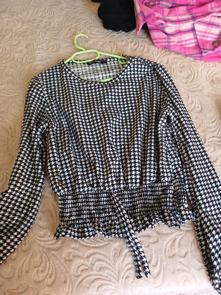 Kadınlar için uzun kollu, kısa kesim, kruvaze yakalı bluz. Bel kısmında pile detayı ve siyah-beyaz desen bulunur. Günlük kullanıma uygun sentetik kumaştan yapılmıştır.