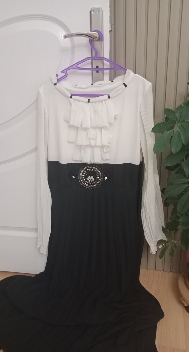 Kadın siyah uzun piliseli abiye tarzı elbise , yumuşak ve esnek kumaş , kol kalın şifon kumaş klasik ve desensiz şık bir tasarıma sahip giyilince çok şık duruyor . birkere giyildi sadece elbisenin uzunluk ölçüsü 140 cm dir s ve m bedene rahatlıkla gelir yandan fermuarlı giyip çıkarması kolay esnek yapısı var ütü istemez kumaş