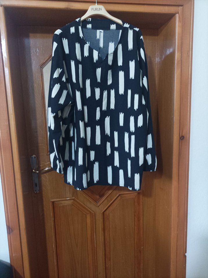 Kadın bluz, uzun kollu, V yakalı ve bol kesimdir. Sentetik kumaştan yapılmış, siyah beyaz batik desenli ve pile detaylıdır.