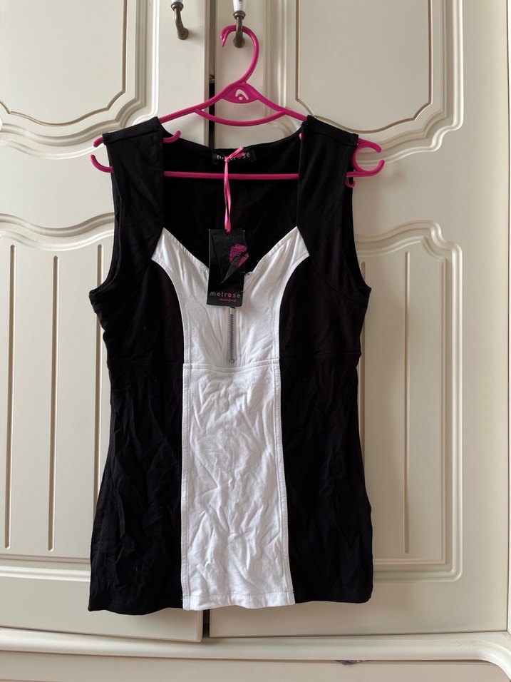V yaka, fermuarlı, siyah beyaz renk bloklu, penye kumaştan kadın tişörtü. Günlük kullanıma uygun, goth ve athleisure tarzında. Ürünün dokusu çok yumuşak ve hoş. Etiketli üründür