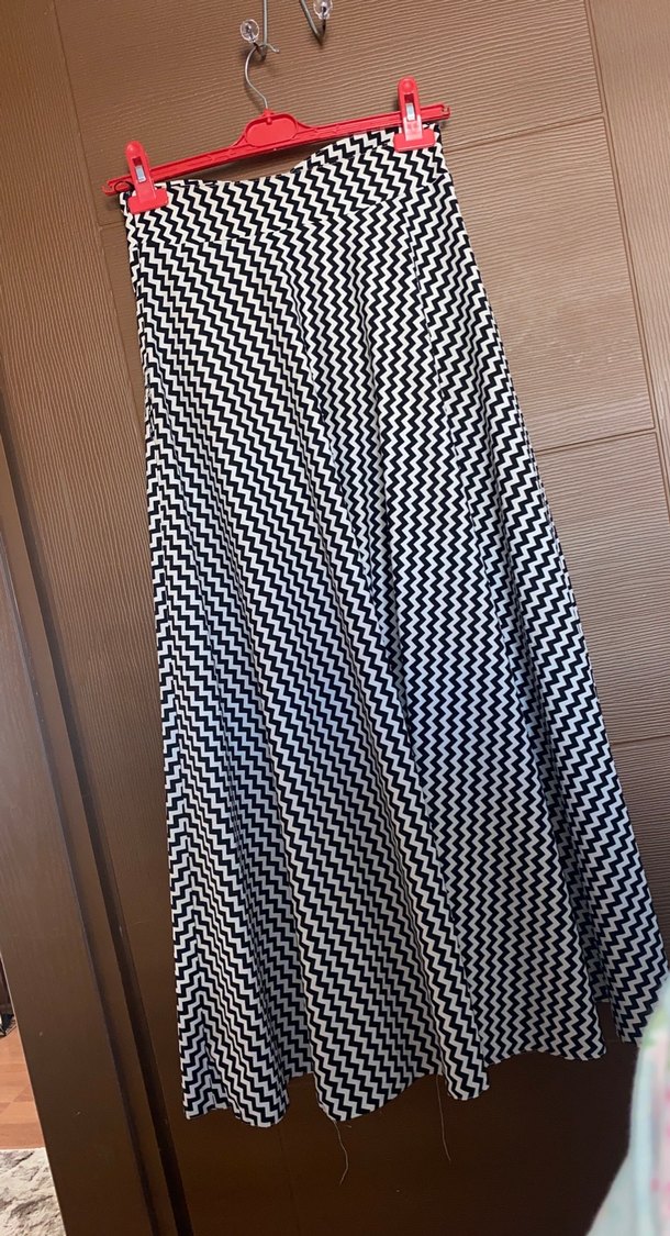 Kadınlar için siyah beyaz zebra desenli, piliseli uzun etek. Sentetik kumaştan üretilmiş, günlük kullanıma uygun regular fit model. Minimalist ve çağdaş tarzda, bohem ve retro görünüme uyumlu. Bir kere kullanıldı herhangi bir kusuru yoktur. Bel detaylı siyah beyaz etek.