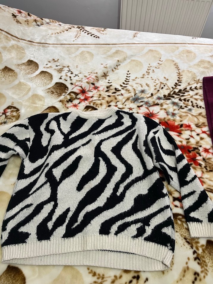 Geniş kesim, uzun kollu ve kayık yaka kadın kazak. Siyah beyaz zebra desenli, kürk detaylı, rahat ve günlük kullanım için uygun.