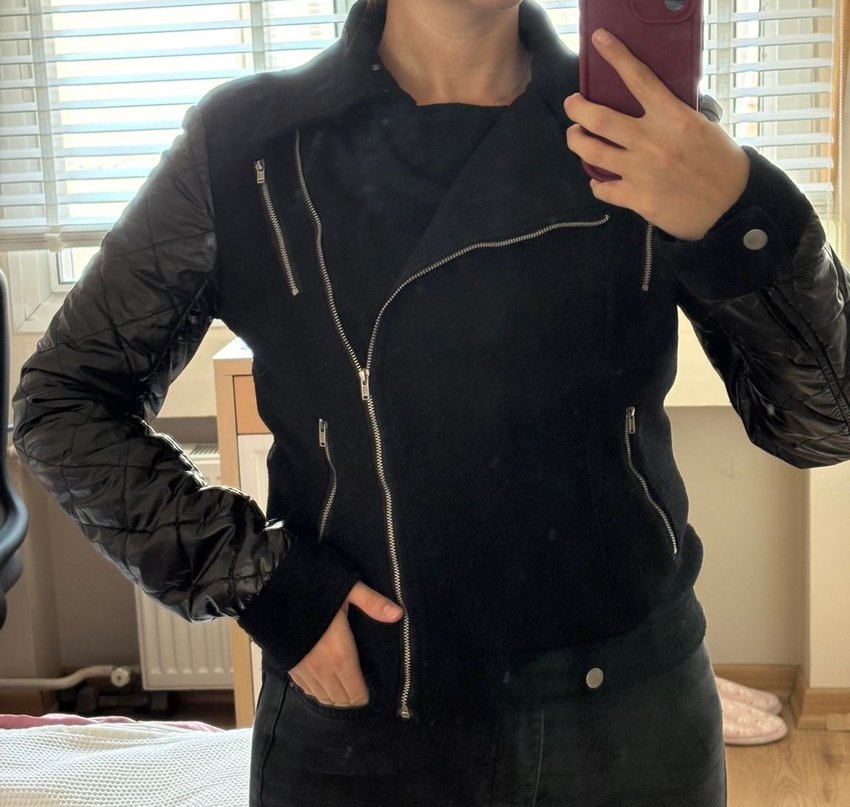 Siyah biker ceket, yüksek yaka, kolları parlak ve çoklu fermuarlı cepler ile günlük kullanıma uygun, vücuda oturan kesimde.