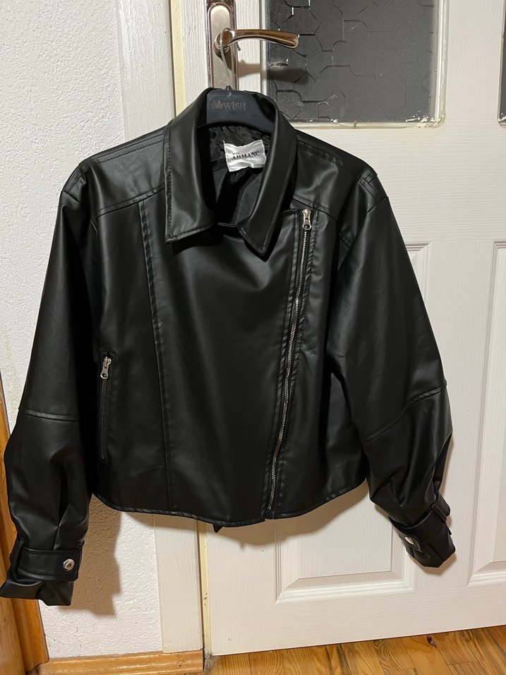 Siyah biker tarzı deri ceket, fitted kesim, uzun kollu ve kesik yaka ile. Fermuarlı detaylara sahip, kısa boyda, rahat sokak stiline uygun. Ben hiç hiymedim