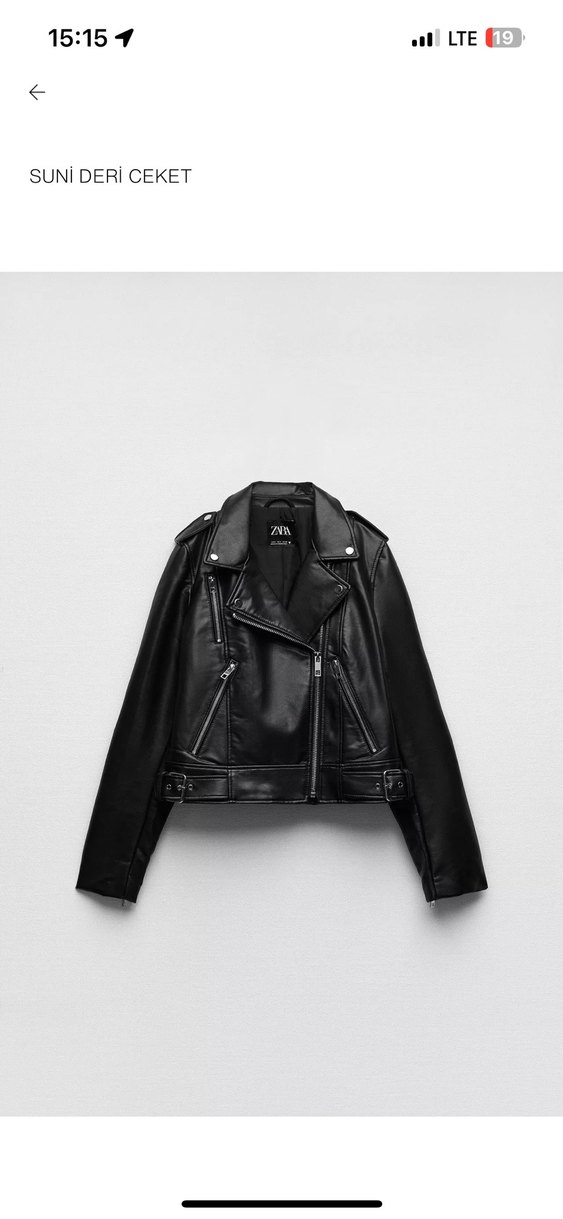 Siyah deri biker ceket, tokalı detaylar ve kesik yaka ile. Askılı kollara ve normal kesime sahip, günlük kullanıma uygun.
