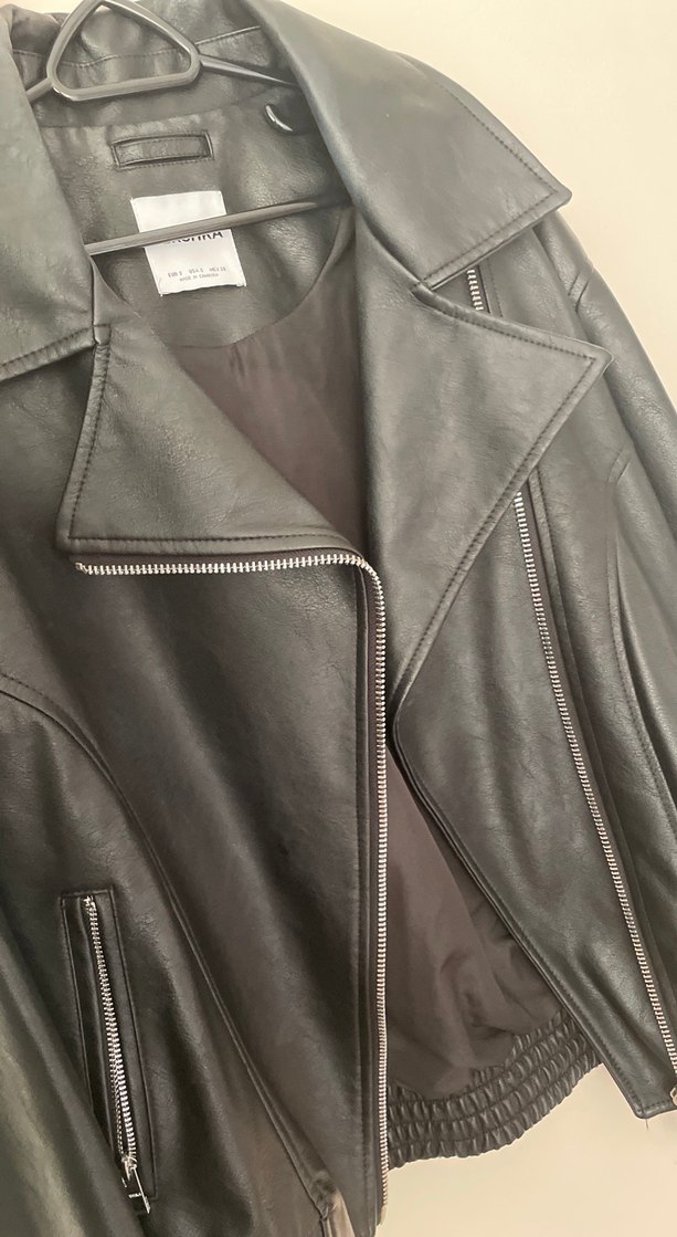 Siyah deri biker ceket, fitted kesim ve kesik yaka ile. Fermuarlı detaylar ve askılı kol tasarımı içerir, günlük kullanım için uygundur.