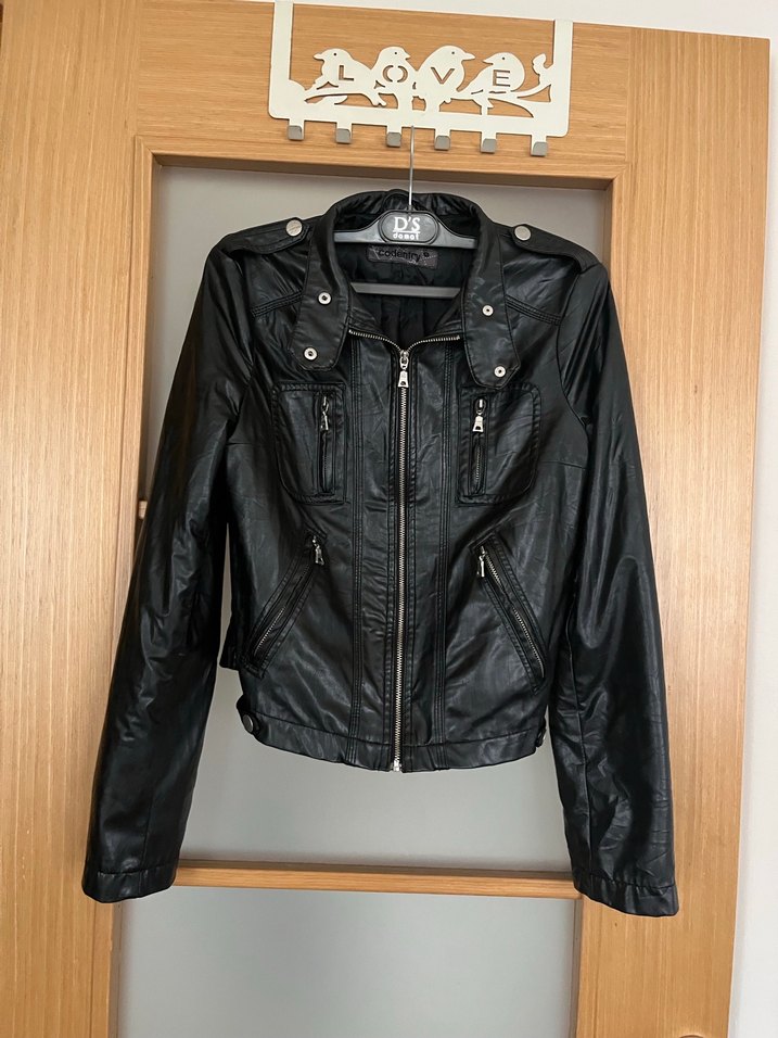 Fitted kesim siyah deri biker ceket, yaka detaylı ve tokalı, grunge punk tarzında. Strappy kollu, normal midi boyda, çoklu fermuarlı ceplidir.