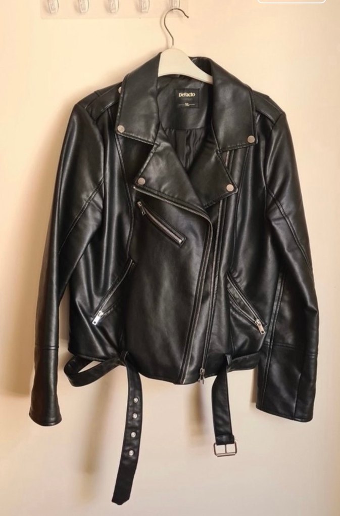 Fıt kesim, siyah deri biker ceket. Yaka detaylı, askılı kollu ve kemerli tasarım, günlük kullanım için grunge punk havası sunar.