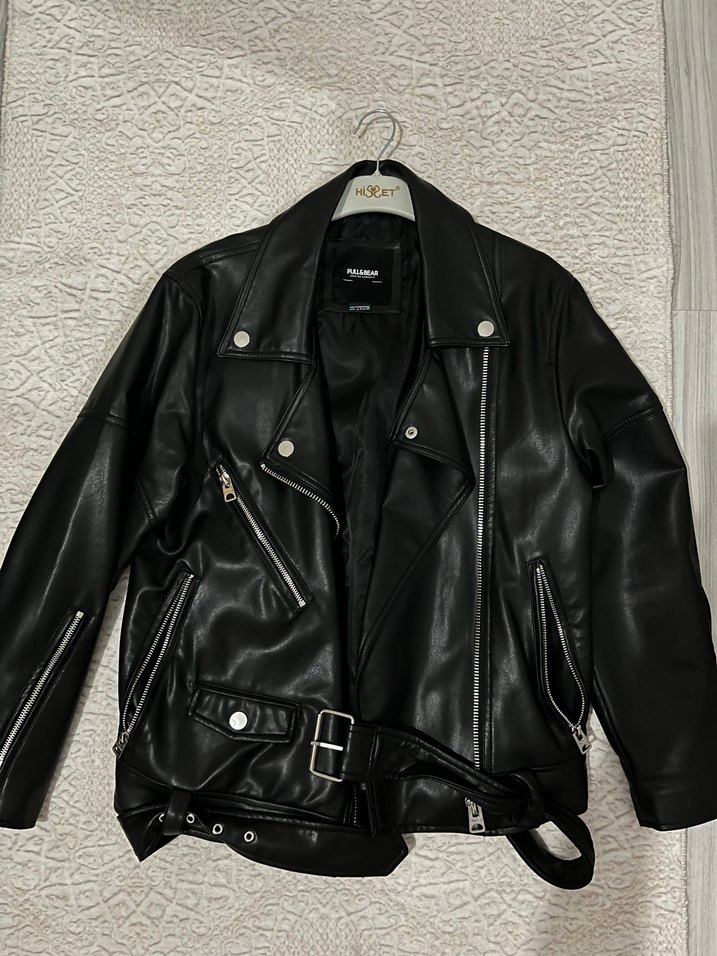 Siyah deri biker ceket, kesik yakalı ve tokalı kemerli. Bol kesim ve askılı kollu, günlük kullanım için grunge punk havasında.