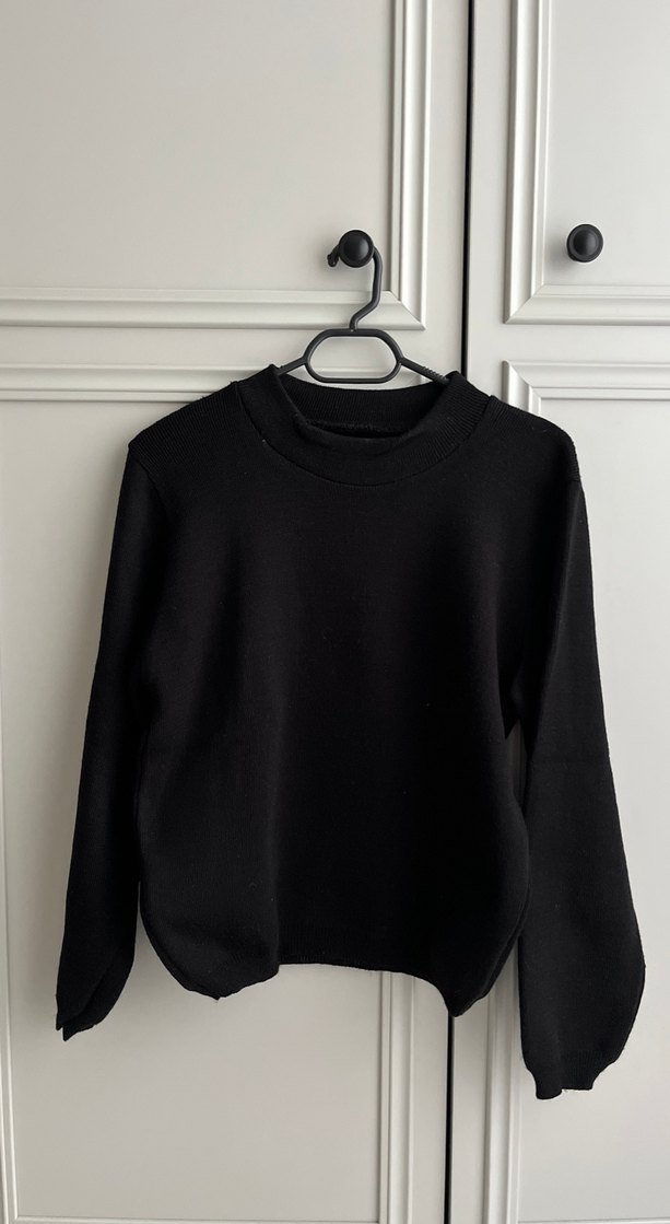 Kadın siyah bisiklet yaka, uzun kollu, bol kesim kazak. Yumuşak ve sıcak kumaştan, minimal ve zahmetsiz şıklık sunar. Yumuşak triko