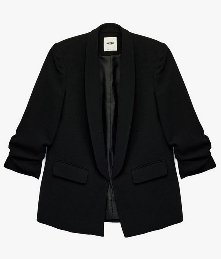 Kadın siyah blazer, yakalı ve saten dokulu. Normal kesim ve midi boyda, ofis için klasik şıklık sunar. ✨ Çok az giyildi hiçbir kusuru yoktur. Alacak olan kişinin güzel günlerde giyinmesi dileğiyle.