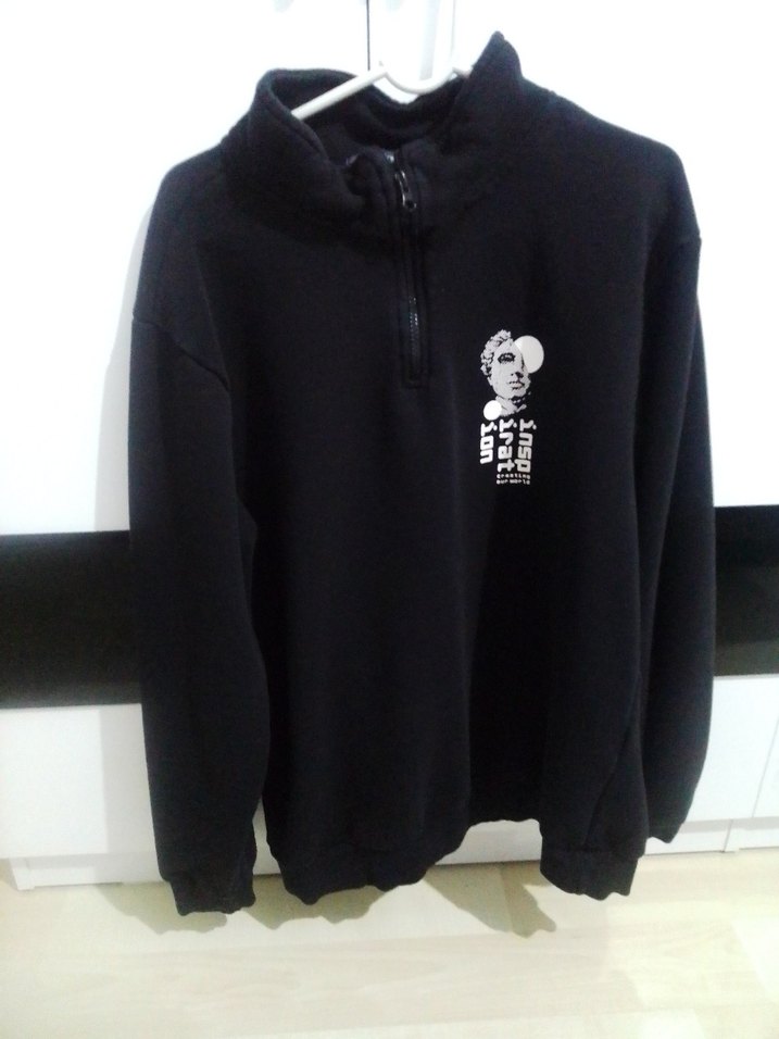 Siyah uzun kollu, boğazı fermuarlı ve yüksek yakalı sweatshirt. Baskılı desene sahip, bol kesim ve normal boyda, yumuşak ve sıcak kumaştan üretilmiştir. Günlük kullanıma uygundur.