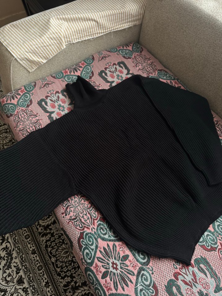 Boğazlı ve uzun kollu siyah triko kazak, oversize kesimiyle rahat ve şık bir sokak stili sunar. Günlük kullanım için uygundur.