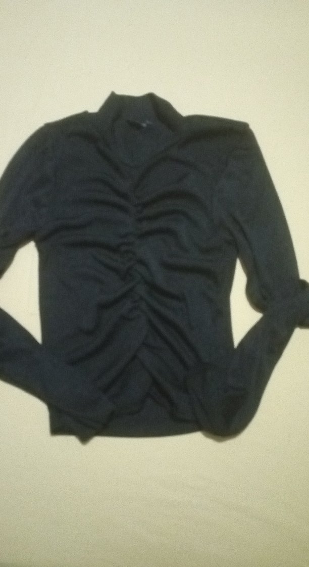 Kadın siyah triko, boğazlı ve pilili detaylara sahip. Yumuşak keten kumaştan, uzun kollu ve midi boyda, günlük kullanıma uygun.