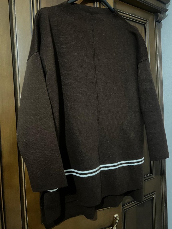 Siyah, boğazlı ve uzun kollu, rahat kesim triko kazak. Örgü dokusu ve alt kısmında ince çizgi detayı bulunur. Günlük rahat sokak stili için uygundur.