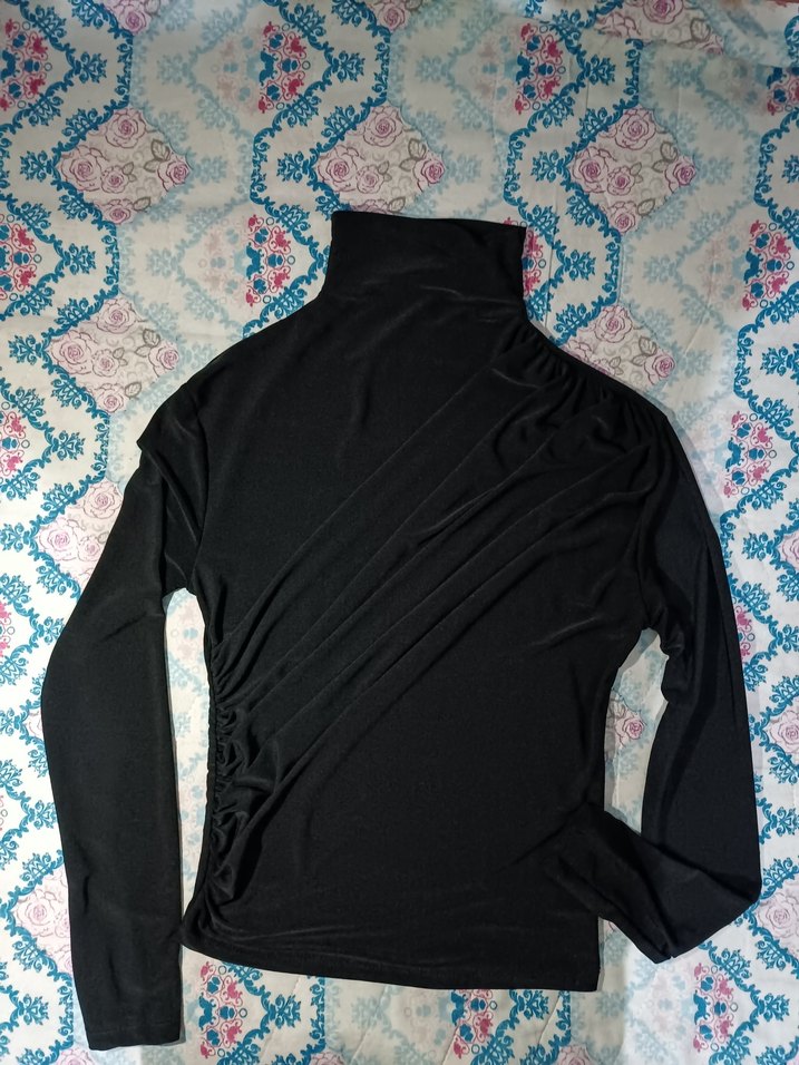 Siyah, boğazlı ve uzun kollu bu kadın bluzu, vücuda oturan kesimi ve drapeli detayıyla dikkat çeker. Sentetik kumaştan üretilmiştir ve günlük kullanım için uygundur.
